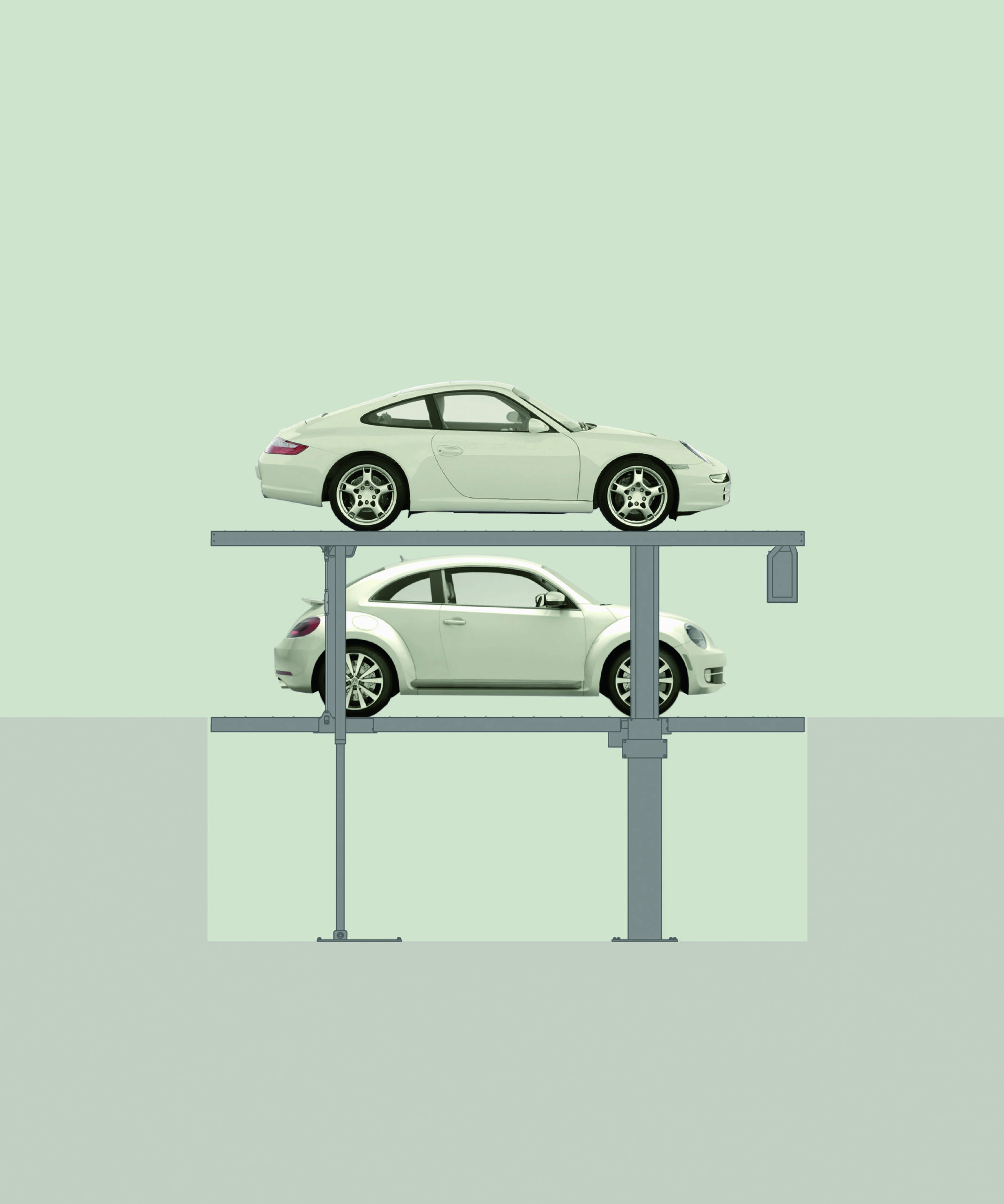 Single units for 2 cars and double units for cars can be arranged in any combination according to the local conditions and settings. The double unit has no columns between the parking spaces for high space efficiency.